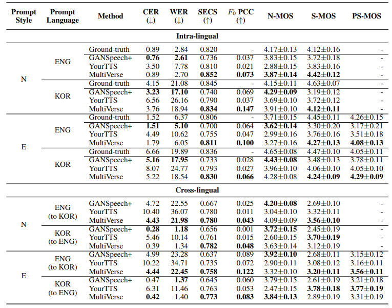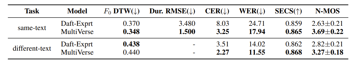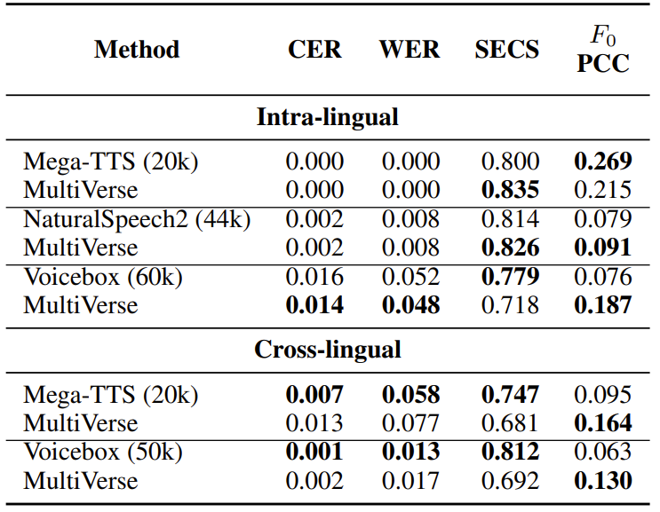 - Cross-/Intra-lingual synthesis 측면에서도 MultiVerse의 성능이 가장 뛰어남