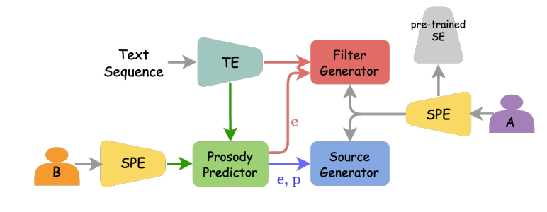 - 여기서 source-filter generator는 acoustic feature embedding을 source representation으로 변환하여 attention mechanism과 modulation에 의한 prompt의 prosody characteristic을 반영