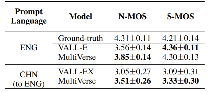 - MOS 측면에서 MultiVerse는 VALL-E 보다 우수한 성능을 보임