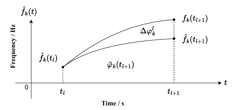 (Eq. 8) $\hat{\varphi}_{k}(t_{l})=\int_{0}^{t_{l}}2\pi\hat{f}_{k}(u)\text{d}u+\sum_{i=0}^{l} \Delta\varphi_{k}^{i}$