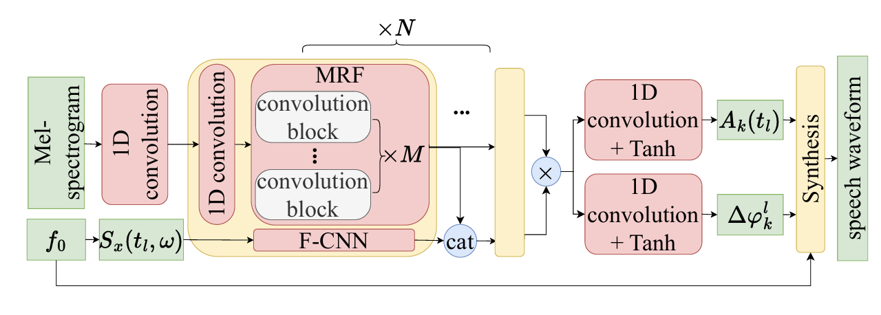 - Synthesis process는 frame-wise parameter ($f_{0}, amplitude, phase)로부터 speech를 생성하는 것을 목표로 함