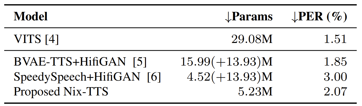 - Nix-TTS는 teacher VITS와 비교해서 0.5%의 차이를 보이면서 더 적은 모델 크기를 가짐