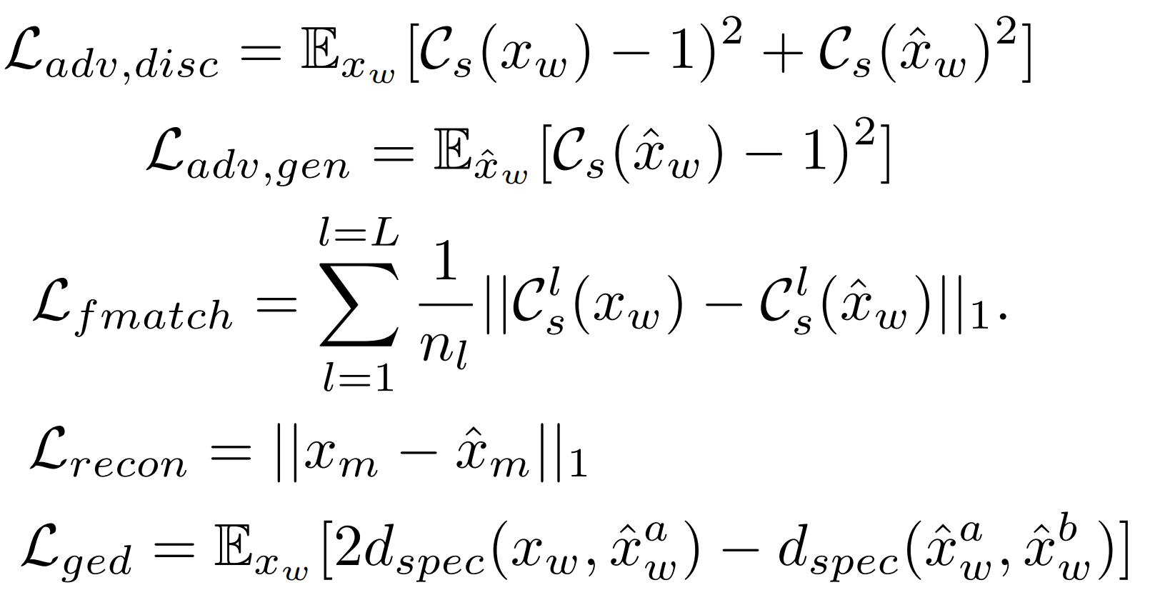 - $\hat{x}^{a}_{w}$, $\hat{x}^{b}_{w}$ : $N(0,1)$에서 가져온 노이즈 sample에 대해 $D_{s}$에서 생성된 오디오 - 최종 Decoder Objective : $L_{D} = L_{adv, disc} + L_{adv, gen} + L_{fmatch} + L_{recon} + L_{ged}$