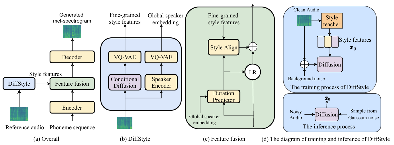 - DiffStyle은 conditional diffusion model, speaker encoder, 2개의 VQ-VAE block으로 구성됨
