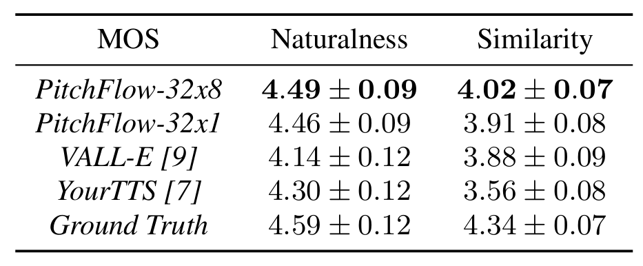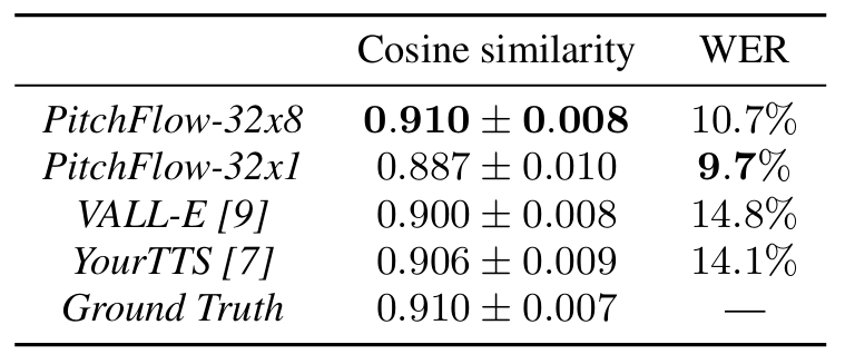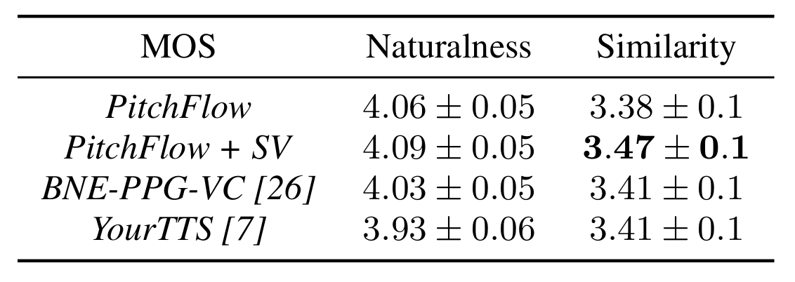 - Voice Cloning 측면에서 PitchFlow의 성능이 가장 뛰어남