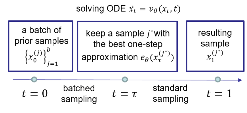 - 먼저 prior sample의 batch $\{X_{0}^{(j)}\}_{j=1}^{b}$를 취하고 batch mode에서 neural network $v_{\theta}$로 vector field를 추정하여 time $t=\tau\in (0,1)$까지의 ODE (Eq. 3)을 solve 함