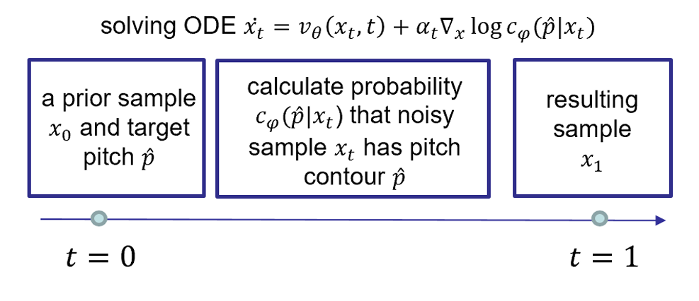- Ground-truth pitch value는 autocorrelation method를 사용하는 Praat partselmouth로 추출됨 - 이후 각 time step $t$에서 sampling 하는 동안 $X_{t}$는 target pitch contour $\hat{p}$와 match 할 probability를 계산하고, 다음의 ODE를 solve 함: