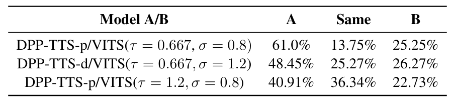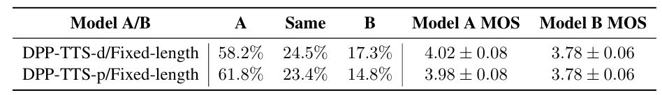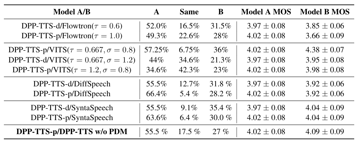 - Side-by-Side test 측면에서 DPP-TTS가 가장 선호됨