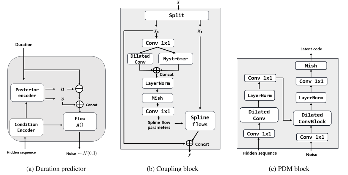 - Stochastic duration predictor는 phoneme duration distribution을 추정하고, stochastic pitch predictor는 hidden sequence에서 phoneme-level pitch distribution을 추정함