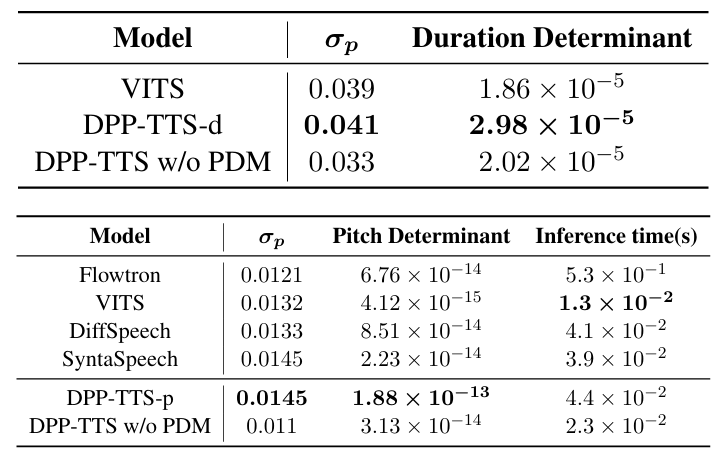 - $\sigma_{p}$, duration, inference time을 비교해 보면, 마찬가지로 DPP-TTS가 가장 뛰어난 성능을 보임