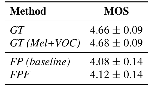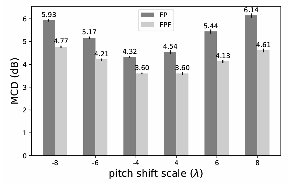 - Mel-Cepstral Distortion (MCD) 측면에서도 FPF는 FP 보다 우수한 성능을 보임