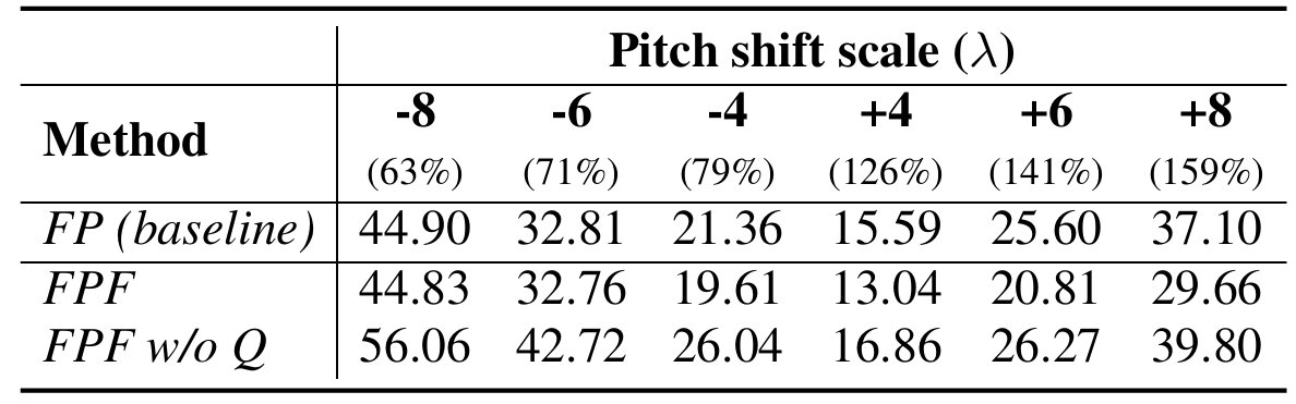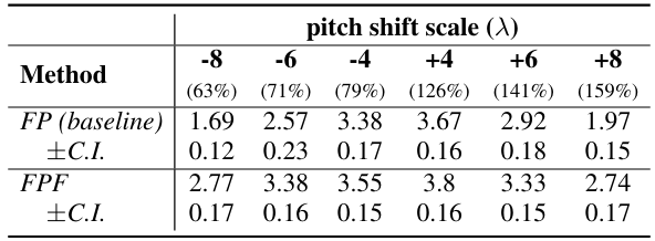 - Pitch-shifted speech에 대해서도 FP 보다 높은 MOS를 달성함
