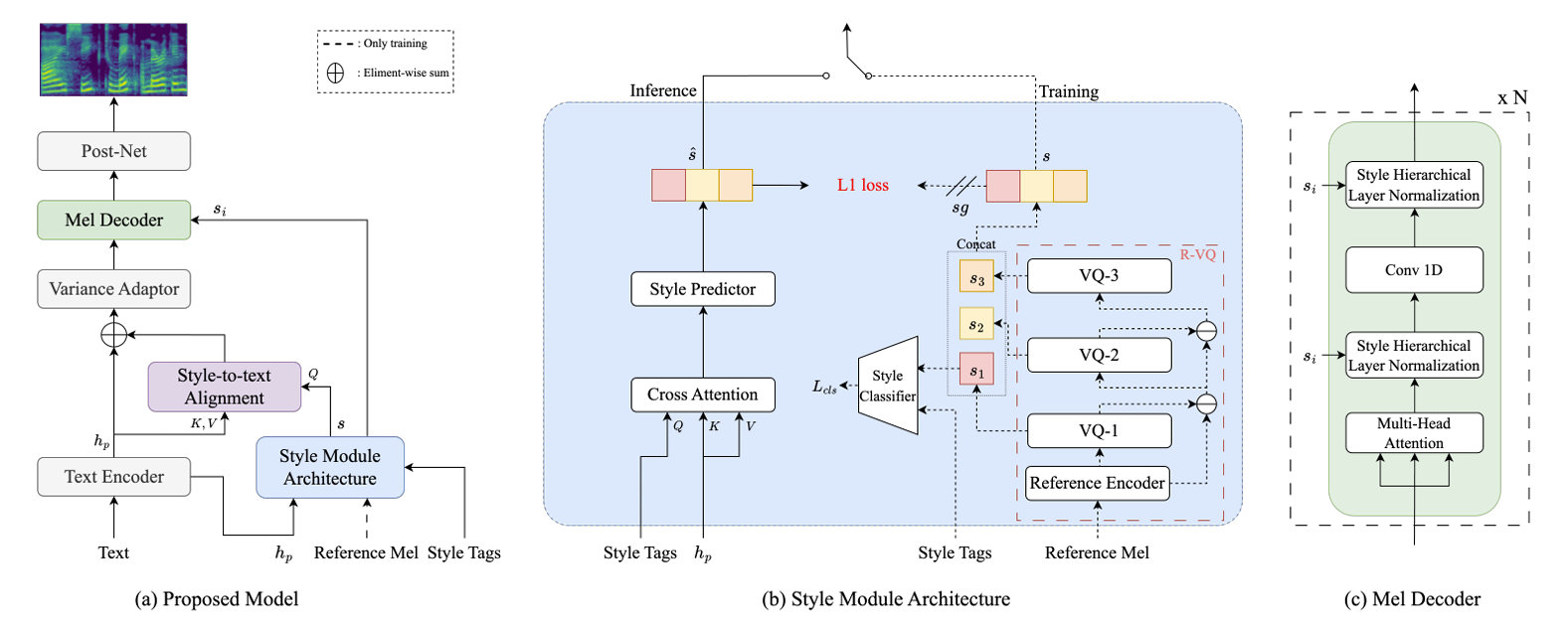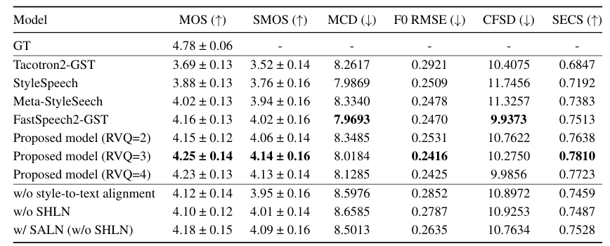 - Text-based style predictor를 위해 Residual Vector Quantization을 도입하고 mel-decoder에 Style-Text Alignment와 Style Hierarchical Layer Normalization을 적용