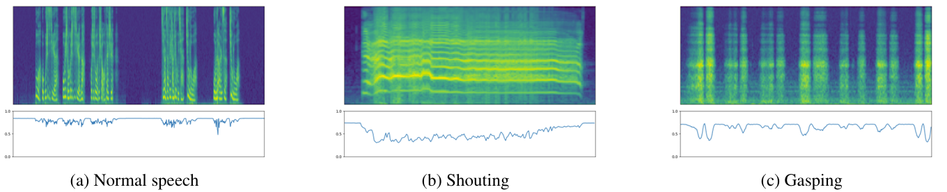 - Normal speech, shouting, gasping을 source speech로 사용하여 mel-spectrum과 attention weight를 시각화