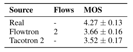 - Flowtron은 Tacotron2보다 높은 MOS를 달성함