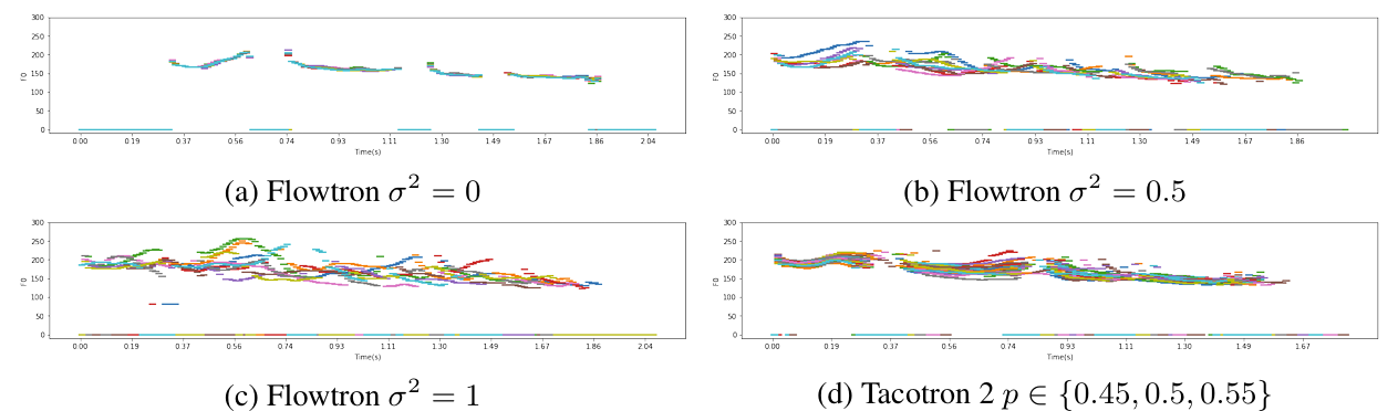 - $F_{0}$ contour 측면에서도 Flowtron은 $\sigma^{2}=0$일 때 variation이 나타나지 않지만 $\sigma^{2}$가 증가할수록 $F_{0}$ variation이 나타남