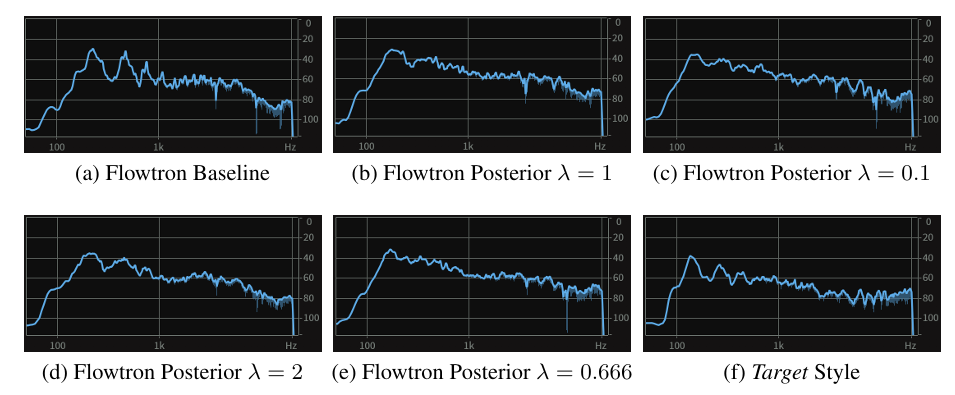 - 결과적으로 $\lambda\in\{0.1, 0.666, 1.0, 2.0\}$으로 합성된 결과를 비교해 보면, $\lambda$가 감소할수록 spectral profile은 baseline style (prior)에서 target style (posterior)로 이동함