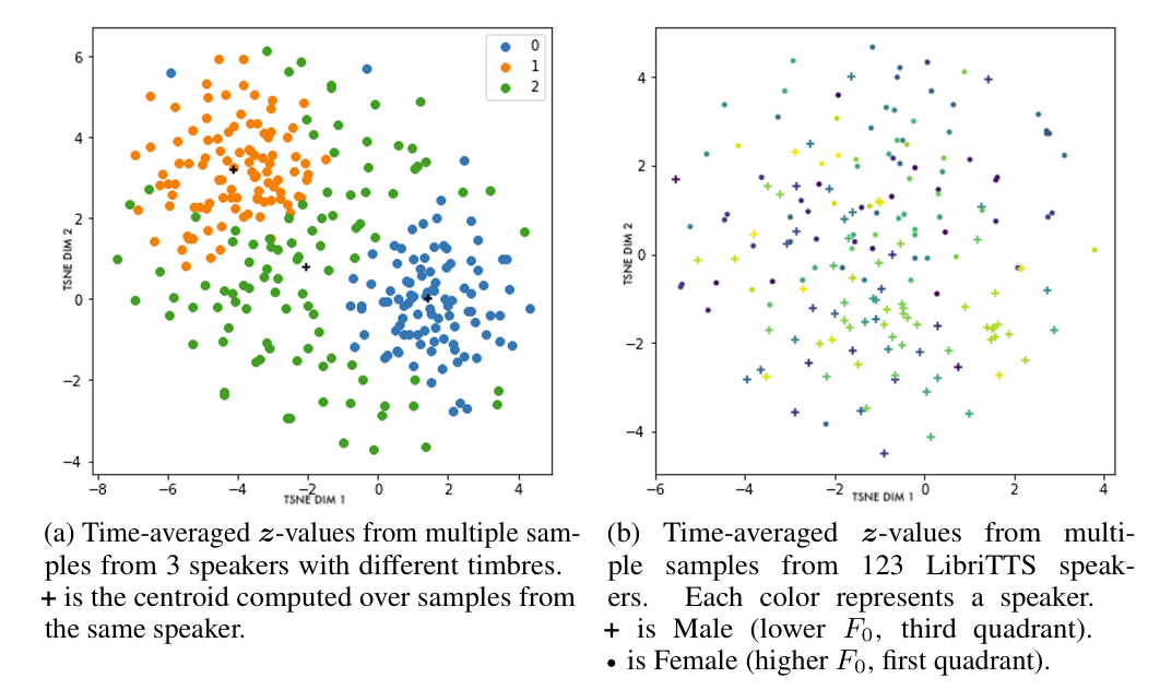 - 아래 그림과 같이 mel-spectrogram에 존재하는 speech characteristic은 $\mathbf{z}$-space region으로 cluster 되어 있음