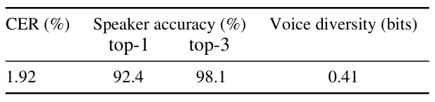 - Zero-shot scenario에서 SPEAR-TTS는 92.4%의 높은 top-1 accuracy를 달성함