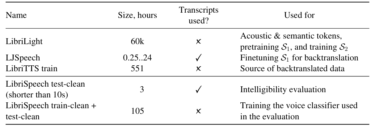 - 즉, text/acoustic token 간의 direct mapping 보다 text transcript에서 semantic token 간의 mapping을 학습하는 것이 더 쉬움 - Semantic/acoustic token은 모두 self-supervised model에서 얻어지므로 $\mathcal{S}_{2}$는 audio-only data를 통해 training 될 수 있음