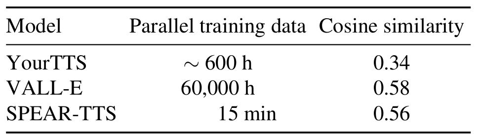 - 다른 zero-shot model과 비교했을 때도 SPEAR-TTS는 15분의 parallel data 만으로도 높은 similarity를 달성함