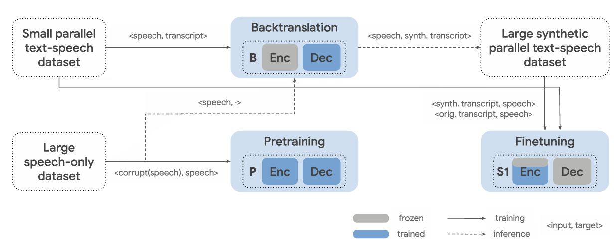 - 이때 backtranslation을 통해 available parallel data를 기반으로 speech-to-text model을 학습한 다음, audio-only corpus에서 synthetic parallel data를 생성할 수 있음 - 특히 SPEAR-TTS는 two-stage architecture로 인해 semantic token과 text 간의 translation으로 구현될 수 있음