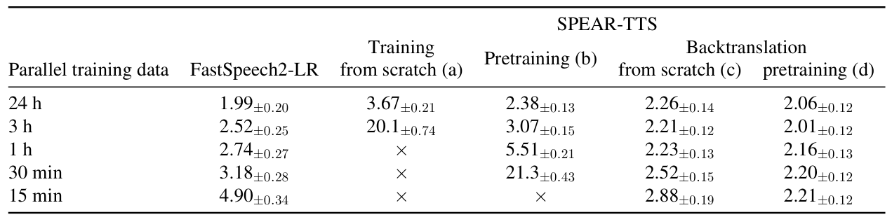 - 결과적으로 intelligibilty 측면에서 parallel data의 양이 줄어드는 경우, (a)는 high error rate를 보이는 반면 (b)의 pretraining으로 인해 SPEAR-TTS는 낮은 CER을 유지할 수 있음