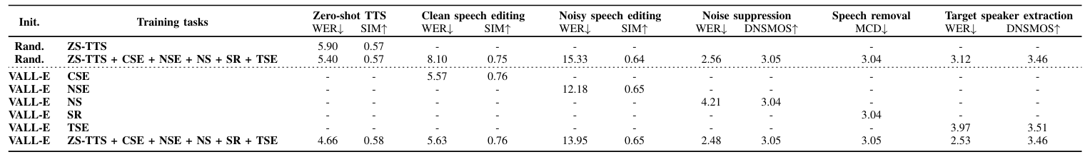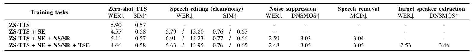 - Multi-task training은 zero-shot TTS에서 WER을 개선하고 additional task를 처리할 수 있는 ability를 제공함