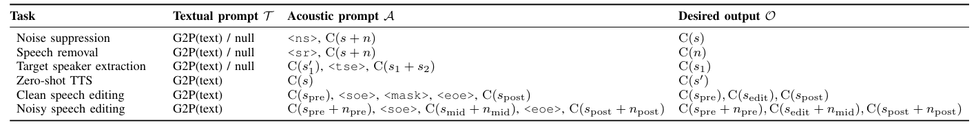 - Zero-shot Text-to-Speech, Speech Editing, Noise Suppression, Target Speaker Extraction 등의 다양한 task를 지원하는 speech model