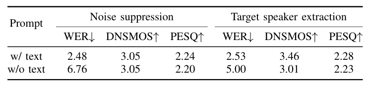 - Prompt를 추가하는 경우 noise suppression과 target speaker extraction의 성능을 향상할 수 있음