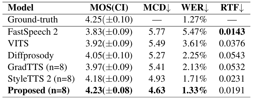 - Comparisons : DiffProsody, FastSpeech2, VITS, Grad-TTS, StyleTTS2