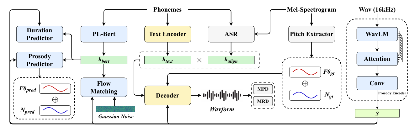 - Speech LLM을 통해 acoustic feature를 추출하고 해당 feature를 prosody latent space에 mapping 한 다음, conditional flow matching을 사용해 input text로 condition 된 prosodic vector를 생성