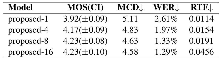 - NFE condition에 따른 성능 차이를 비교해 보면, $n=1$일 때도 ProsodyFlow는 baseline model 수준의 합성 품질을 달성할 수 있음