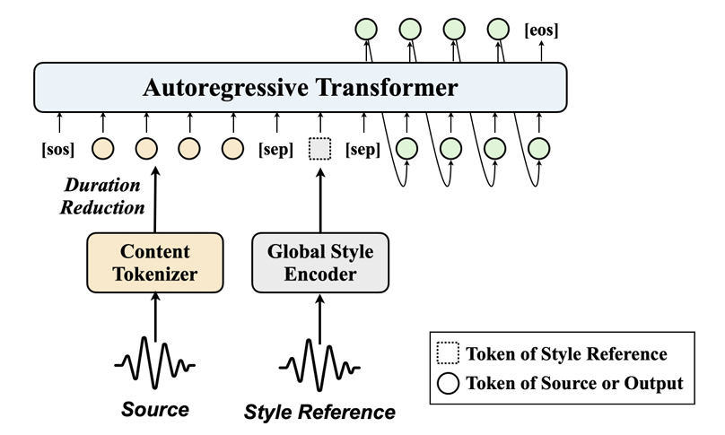 - 이때 decoder-only autoregressive transformer를 사용해 style을 modeling 함 - Timbre reference로 speech prompt가 주어졌을 때, content-style token으로부터 mel-spectrogram과 같은 acoustic representation을 생성하는 Acoustic Modeling을 활용