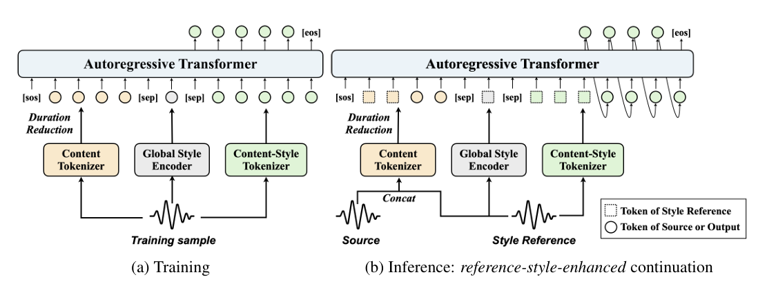 - Inference 시에는 source speech $u_{i}$와 style reference $u_{sr}$에 대해, autoregressive generation을 위한 input sequence $[\langle\text{SOS}\rangle,\mathbf{Q}'_{c}(u_{sr}\oplus u_{i}),\mathbf{g}(u_{sr}),\mathbf{Q}_{s}(u_{sr})]$를 전달하여 reference-style-enhanced continuation을 수행할 수 있음
