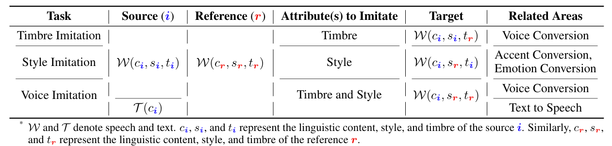 - Voice imitation은 speaker identity imitation, speaking style/accent/emotion imitation, zero-shot text-to-speech (TTS) 등의 task를 포괄함