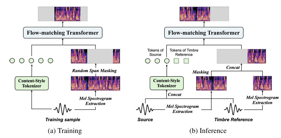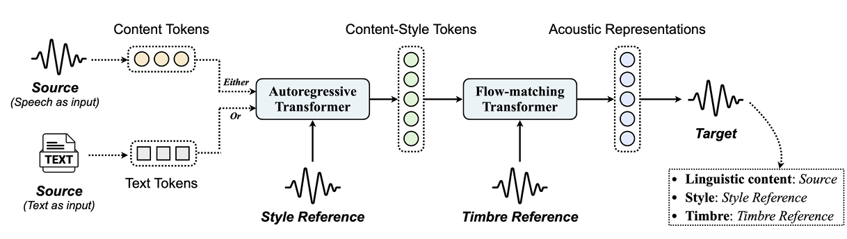 - Flow-matching transfromer를 활용하여 timbre-controllable generation을 수행함 - 추가적으로 content-style/content token을 얻기 위해 timbre, style, linguistic content를 gradually decouple 하는 self-supervised method를 설계