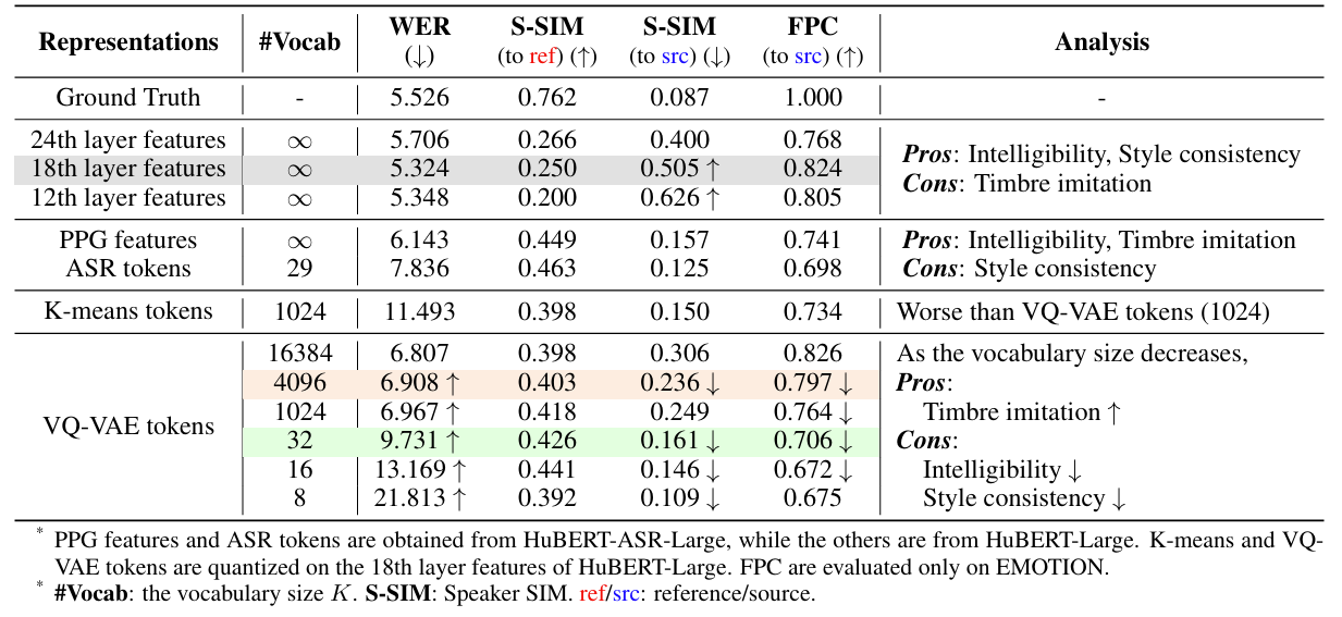 - VQ-VAE를 통한 HuBERT hidden feature quantization은 lossy compression으로 볼 수 있으므로, AutoVC와 같이 VQ codebook의 vocabulary size를 information bottleneck으로 취급할 수 있음