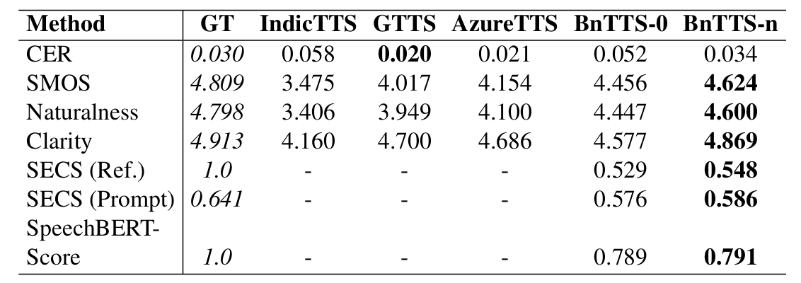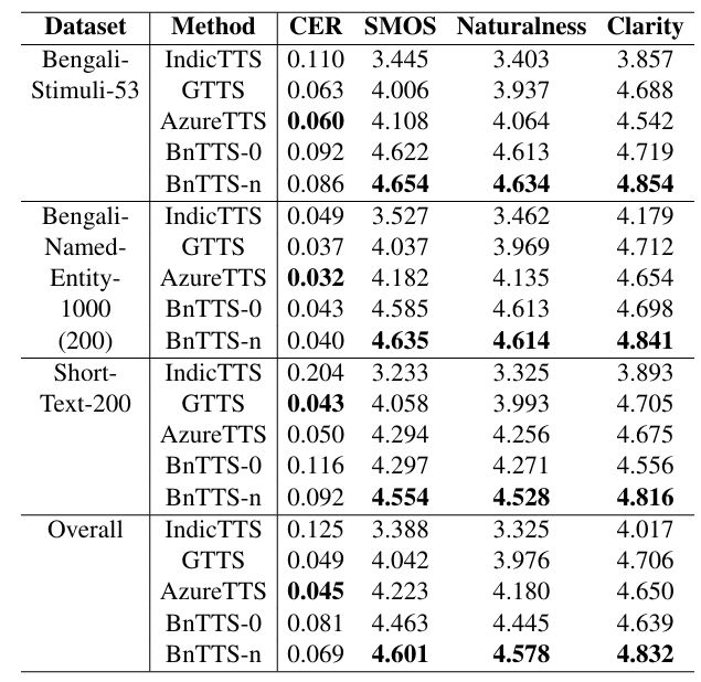 - BnTTS는 SMOS, Naturalness, Clarity와 같은 subjective evaluation 측면에서 우수한 성능을 보임