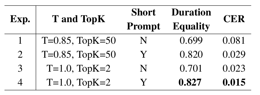 - 이 경우 short prompt를 사용하고 $T=1.0, \text{TopK}=2$로 조정하면 성능을 향상할 수 있음