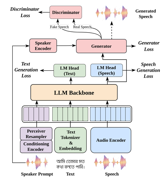 (Eq. 2) $\mathbf{X}=\mathbf{S}_{p}\oplus\mathbf{T}_{e}\oplus\mathbf{Y}_{e}\in\mathbb{R}^{(N+P+M)\times d}$ - LLM은 $\mathbf{X}$를 input으로 하여 text, speaker, spectrogram embedding에 대한 hidden state를 가지는 output $\mathbf{H}$를 생성함