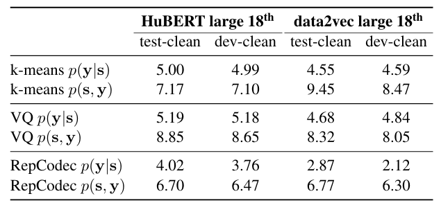 - 실제로 AudioLM에서 w2v-BERT XL의 $k$-means discrete token을 사용하는 경우 WER이 2.5%에서 6.0%로 증가함