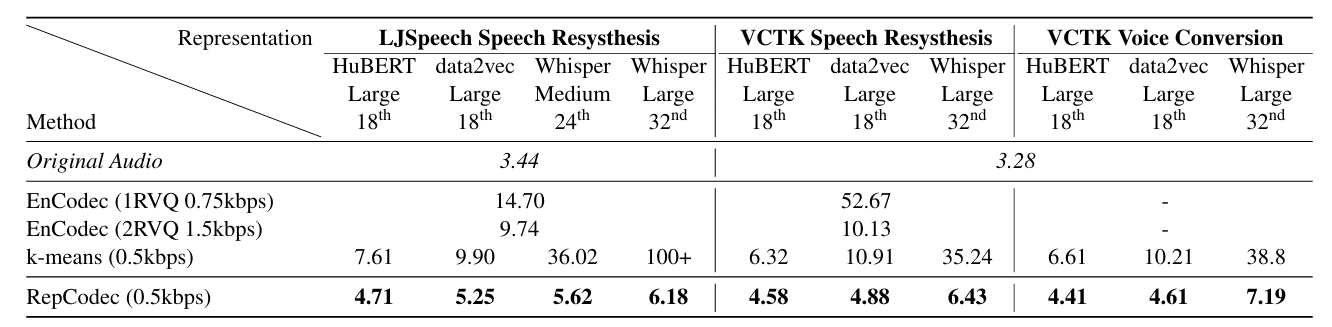 - ASR task에 대해 RepCodec이 가장 우수한 성능을 보임