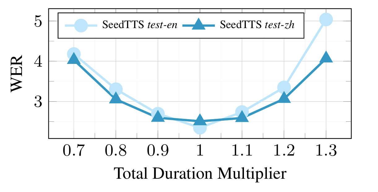 - Duration multiplier가 $1.0$인 경우 가장 낮은 WER을 달성함