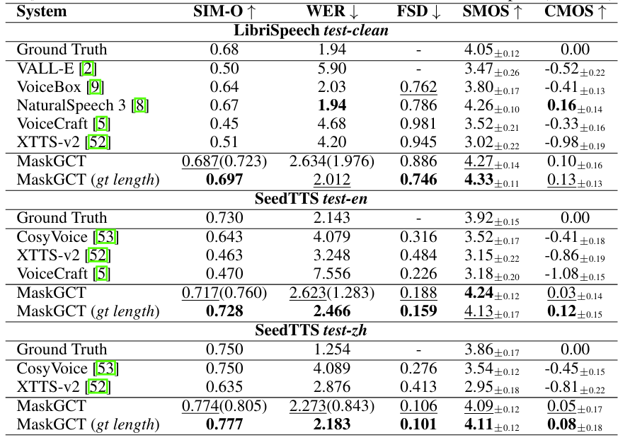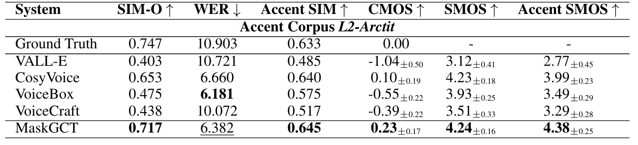 - 전체적으로 MaskGCT의 성능이 가장 뛰어남