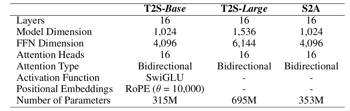 - $\mathbf{P}$ : text token sequence - Second stage model은 $p_{\theta_{s2}}(\mathbf{A}|\mathbf{A}_{t},(\mathbf{A}^{p},\mathbf{S}))$을 학습하도록 training 됨
