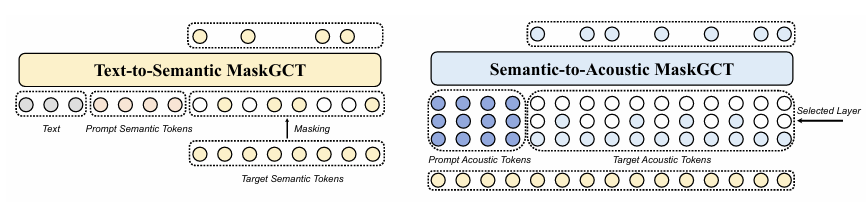 - MaskGCT는 autoregressive model이나 text-to-speech alignment information 없이 non-autoregressive maksed generative transformer를 사용하여 Text-to-Semantic (T2S) model을 training 함