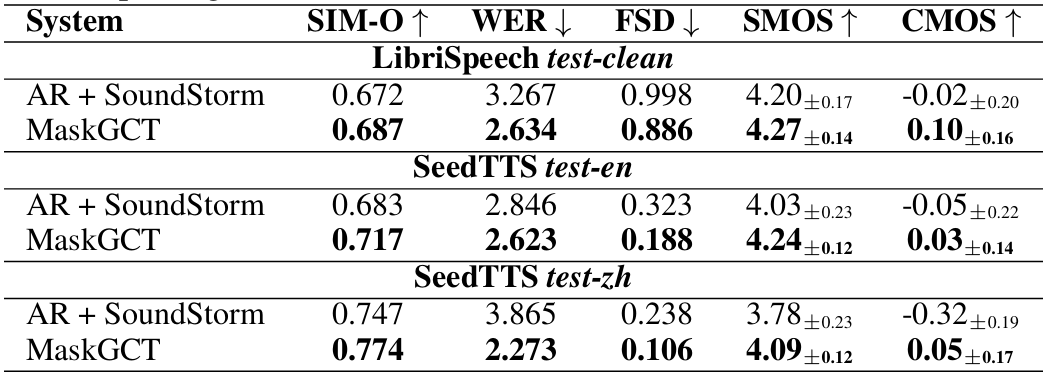 - AR + SoundStorm으로 구성된 model과 비교하여 MaskGCT가 더 robust 한 성능을 보임