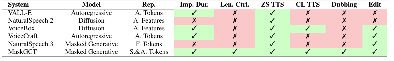 - BUT, MaskGCT는 text-speech alignment supervision과 phone-level duration prediction 없이 두 stage 모두에 non-autoregressive masked generative modeling을 도입함