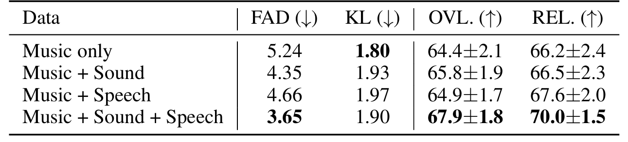 - 서로 다른 domain composition에 대해서도 UniAudio는 안정적인 성능을 달성함